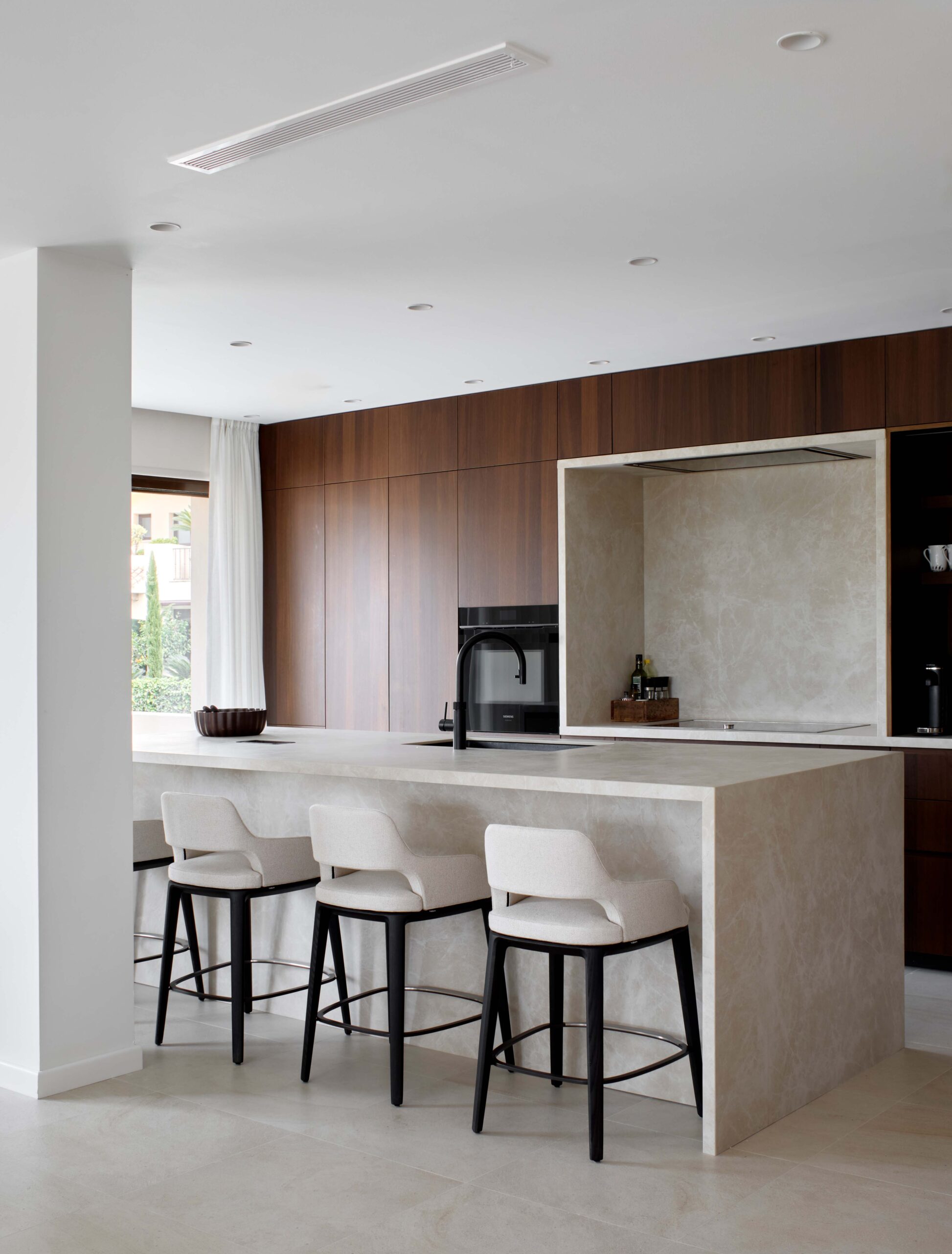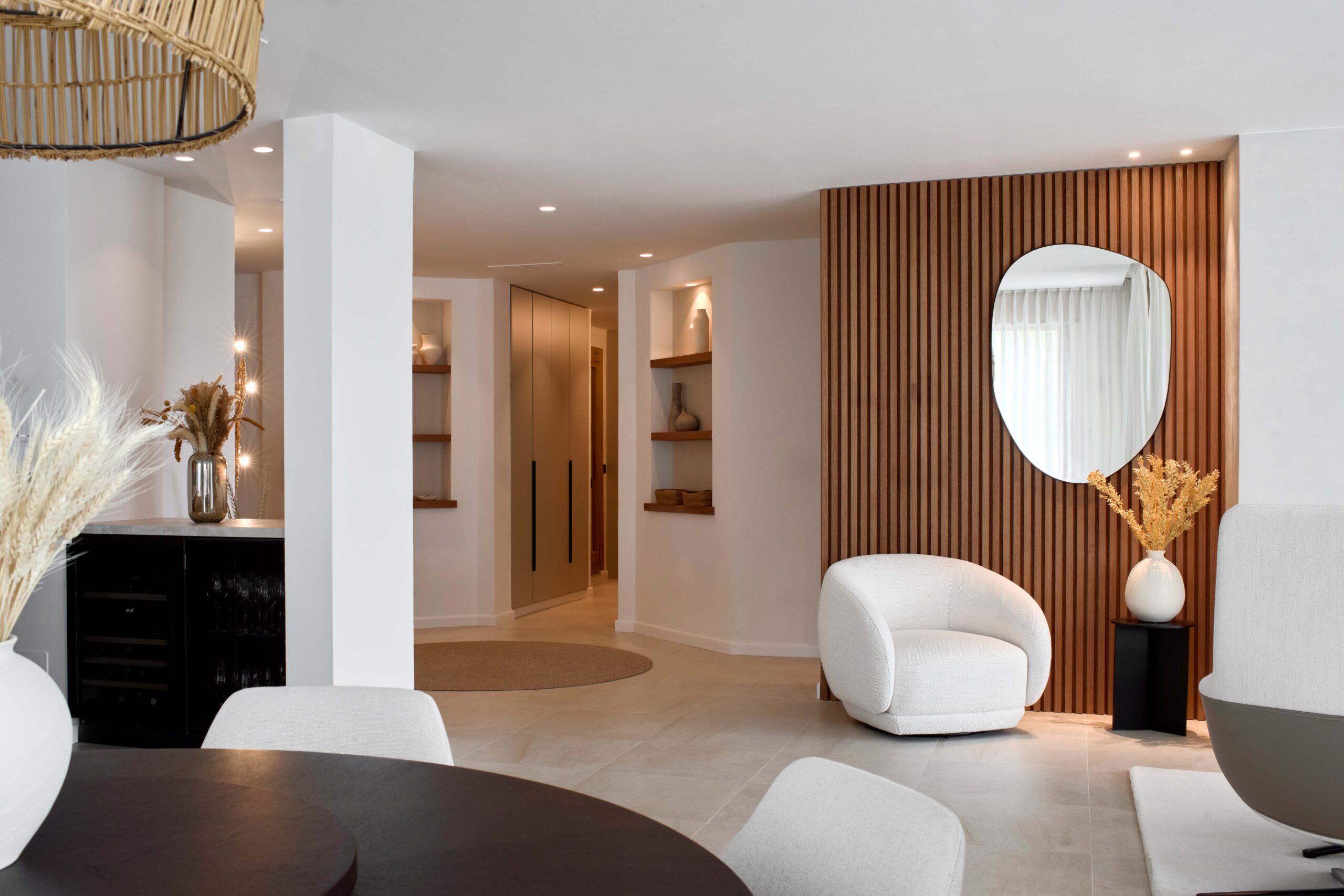 This 185 m² apartment, including its exterior terraces, underwent a complete 360-degree transformation, aiming to modernize the space while elevating the quality of every finish. The open-plan living area allowed for an incredible kitchen with an integrated island and breakfast bar, creating a seamless connection between cooking, dining, and living spaces. Each bedroom was designed with its own identity, using noble materials such as natural stone and wood to bring warmth and refinement. Furniture and finishes were carefully selected to maintain a cohesive color palette and harmonious atmosphere throughout the apartment. Built with care. Designed for living.
